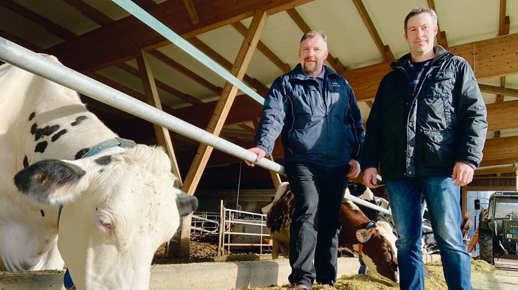 IGBU-Präsident Samuel Guggisberg (r.) und Vorstandsmitglied Andreas Bürki auf dessen Betrieb in Richigen BE. Hier wäre auch die langlebige Kuh Delphine von den hängigen Initiativen betroffen. (Bild BauernZeitung, akr)